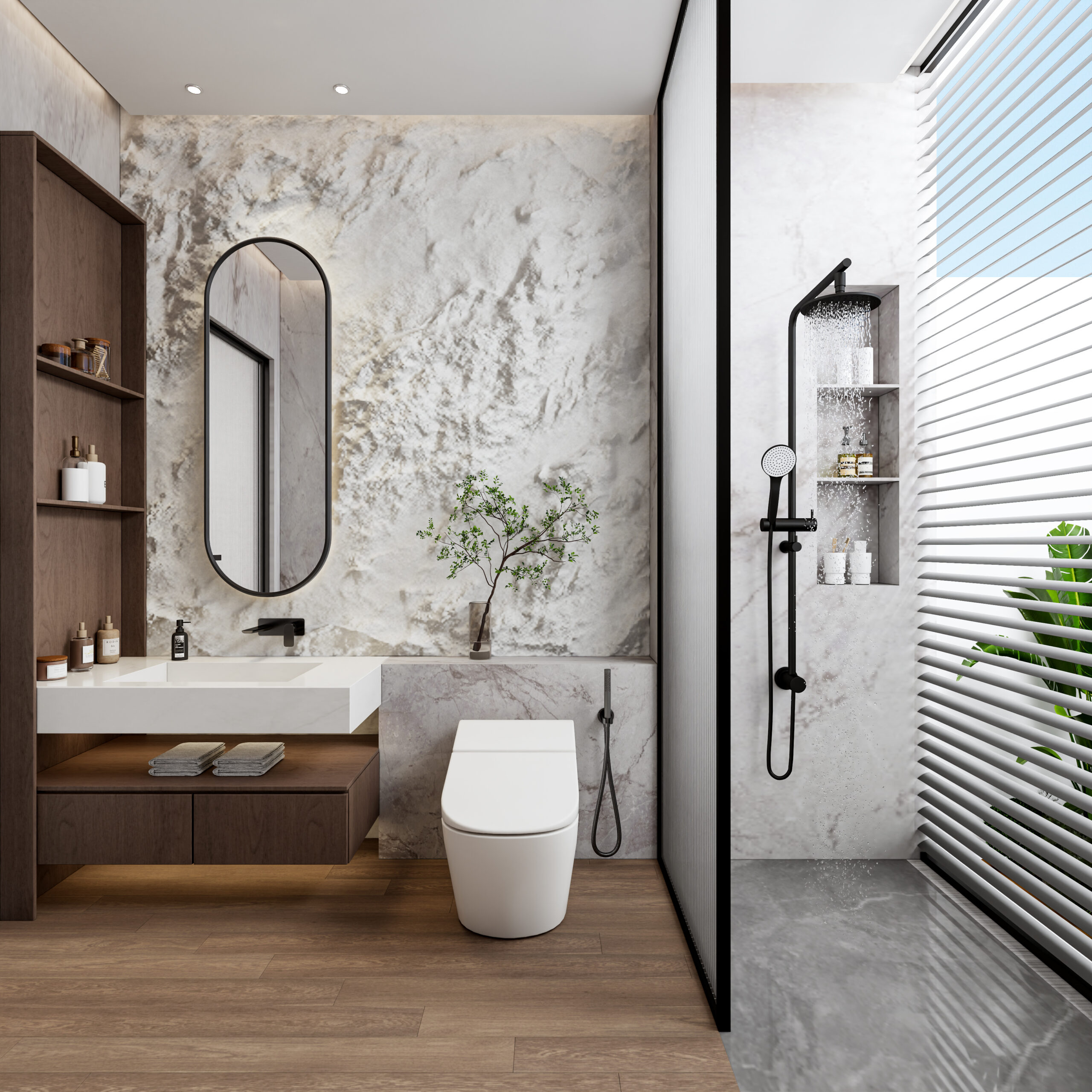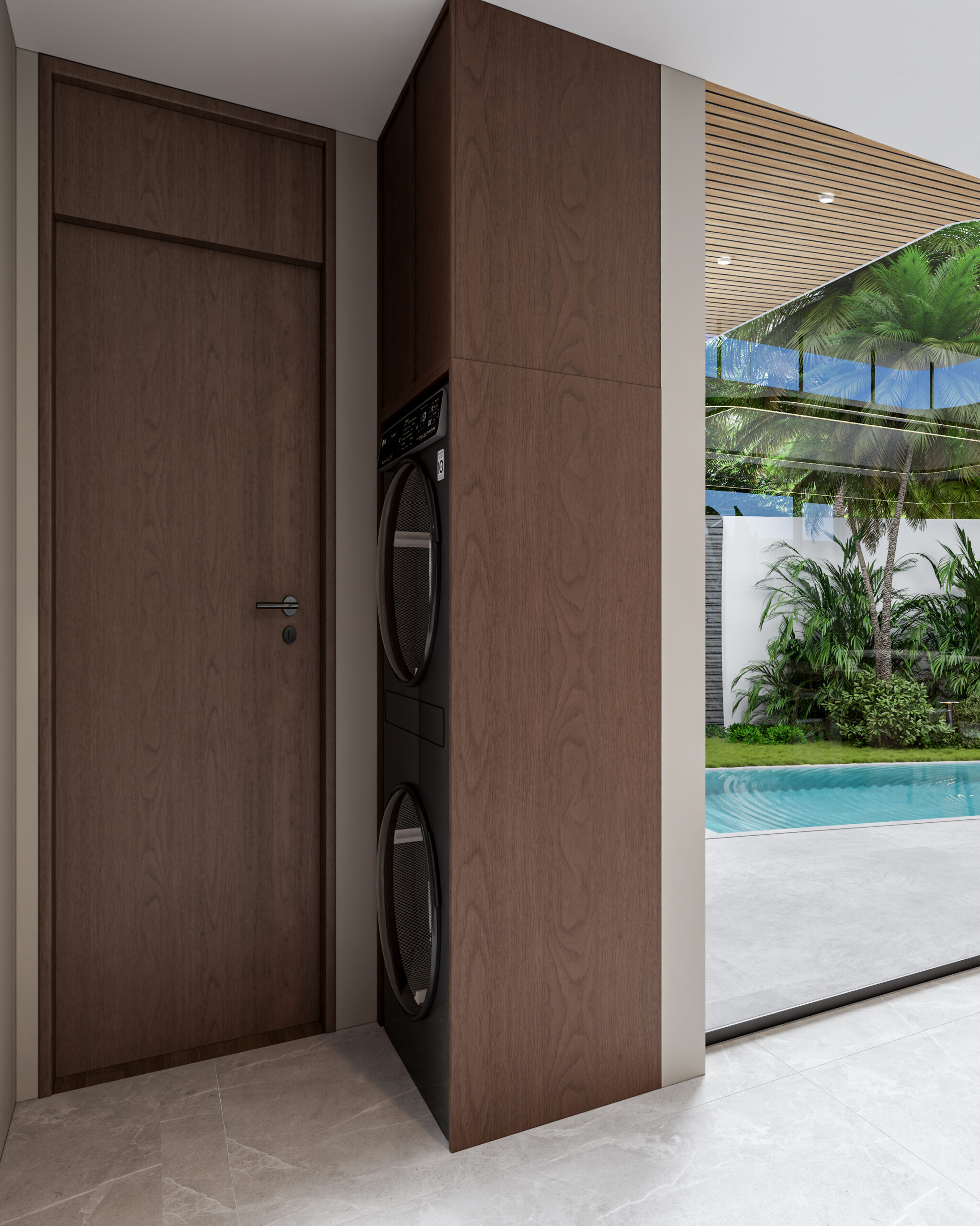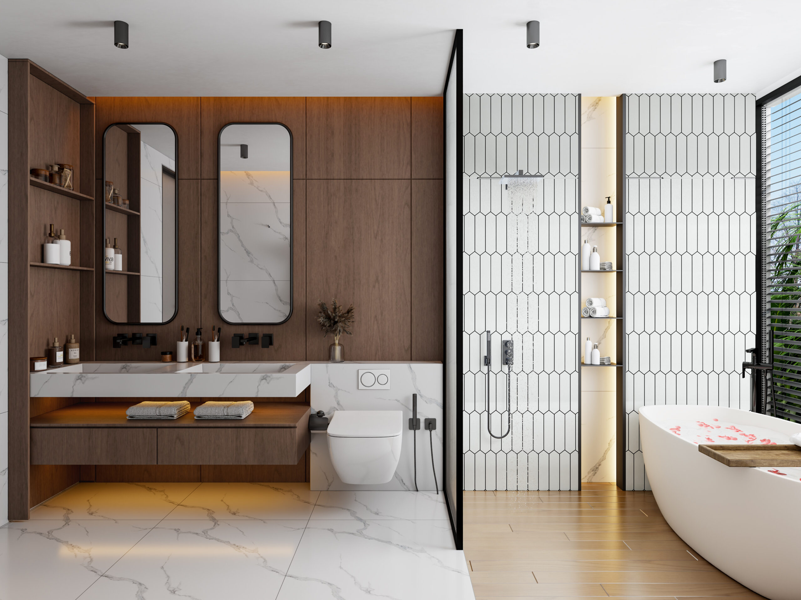 Три спальни с отдельными ванными комнатами, обеспечивающие полную приватность и комфорт. В главной спальне предусмотрена ванна с панорамным видом, создавая атмосферу релакса.
